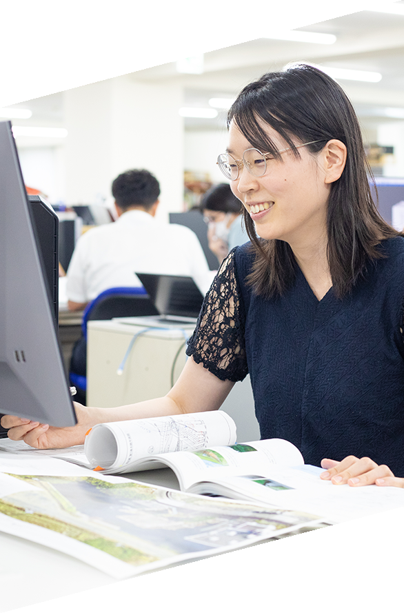 これまでの配属は、入社後3年間は本社の総合計画部、その後の3年間は九州支店に配属となり、現在、再び本社の総合計画部となります。総合計画部では、過年度に実施した報告書の内容を取りまとめ事業計画を策定する仕事(計画業務)に従事しました。九州支店では、水利施設の診断調査、耐震調査、実施設計の仕事(設計業務)に携わりました。6年間の経験から3年前に比べ多様な視点で事業計画の策定に取り組めていると感じています。